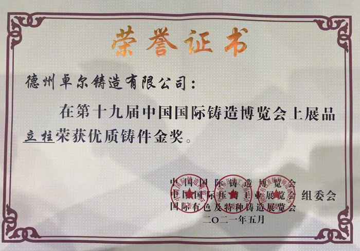熱烈祝賀我公司參展產(chǎn)品在第十九屆中國國際鑄造博覽會上榮獲優(yōu)質(zhì)鑄件金獎。