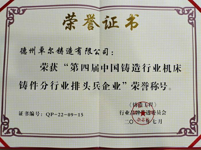 2022年7月25日,第九屆全國鑄造行業(yè)發(fā)展論壇暨中國鑄造協(xié)會第九界會議代表大會在天津勝利召開,德州卓爾科技有限公司榮獲“第四屆中國鑄造行業(yè)排頭兵企業(yè)”及“第四屆鑄造行業(yè)機床鑄件分行業(yè)排頭兵企業(yè)”榮譽稱號