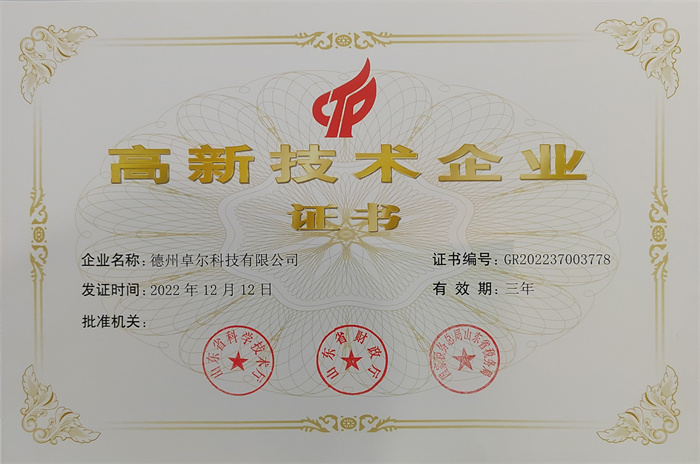 2月6日,山東省科學(xué)技術(shù)廳、山東省財(cái)政廳、稅務(wù)總局山東省稅務(wù)局聯(lián)合頒發(fā)“高新技術(shù)企業(yè)”證書(shū),認(rèn)定德州卓爾科技有限公司為高新技術(shù)企業(yè)。
