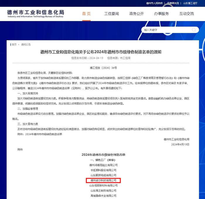 4月19日,德州市工業(yè)和信息化局公示了2024年市級綠色制造名單,山東普利森集團旗下的德州卓爾科技有限公司獲評“綠色工廠”榮譽稱號。